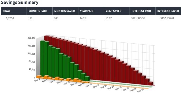 The following is an example of paying off a mortgage using HEAP™. The maroon bars are a 30-year mortgage and the green bars are your mortgage when using HEAP™